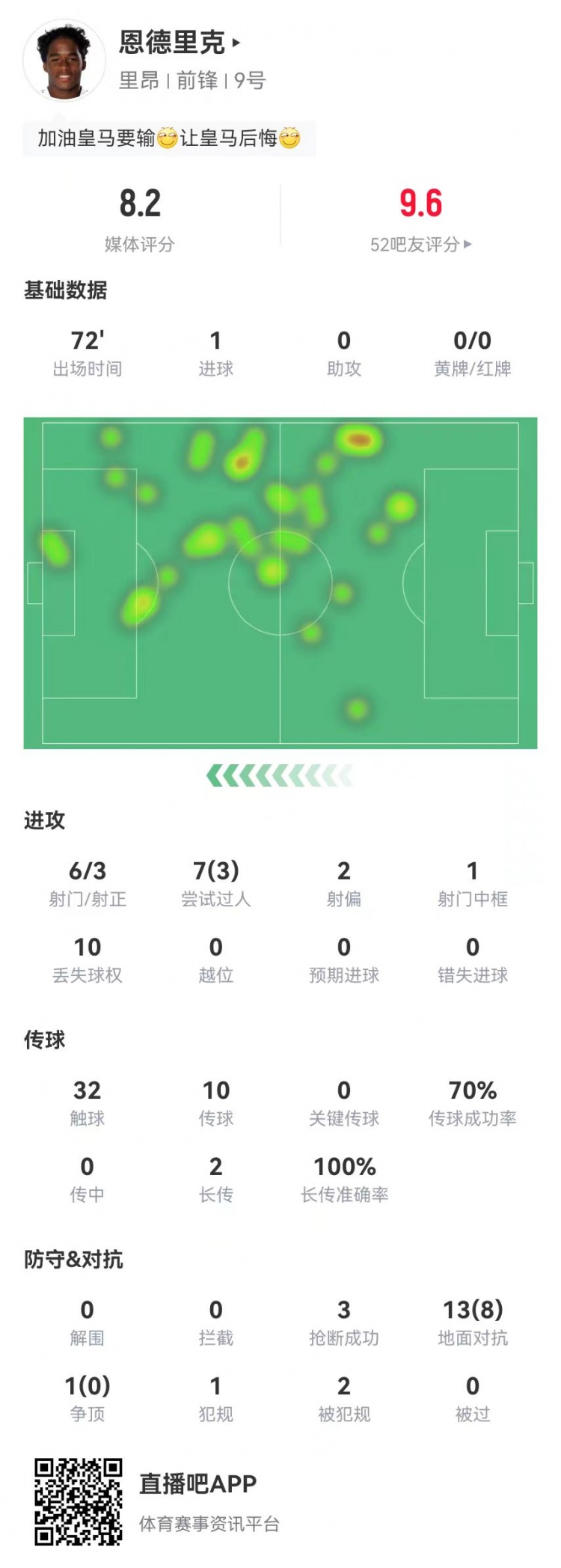 直播吧1月12日讯 里昂在本轮法国杯对阵里尔,从皇马租借加盟的新援恩德里克本场数据如下: