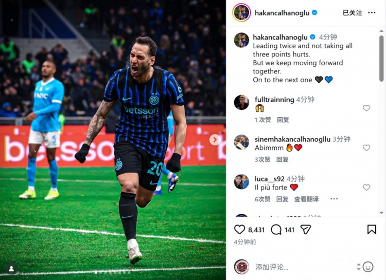 恰尔汗奥卢赛后在社交媒体上写道:“两度领先却未能全取三分,令人扼腕。但我们仍将携手前行。专注于下一场。”