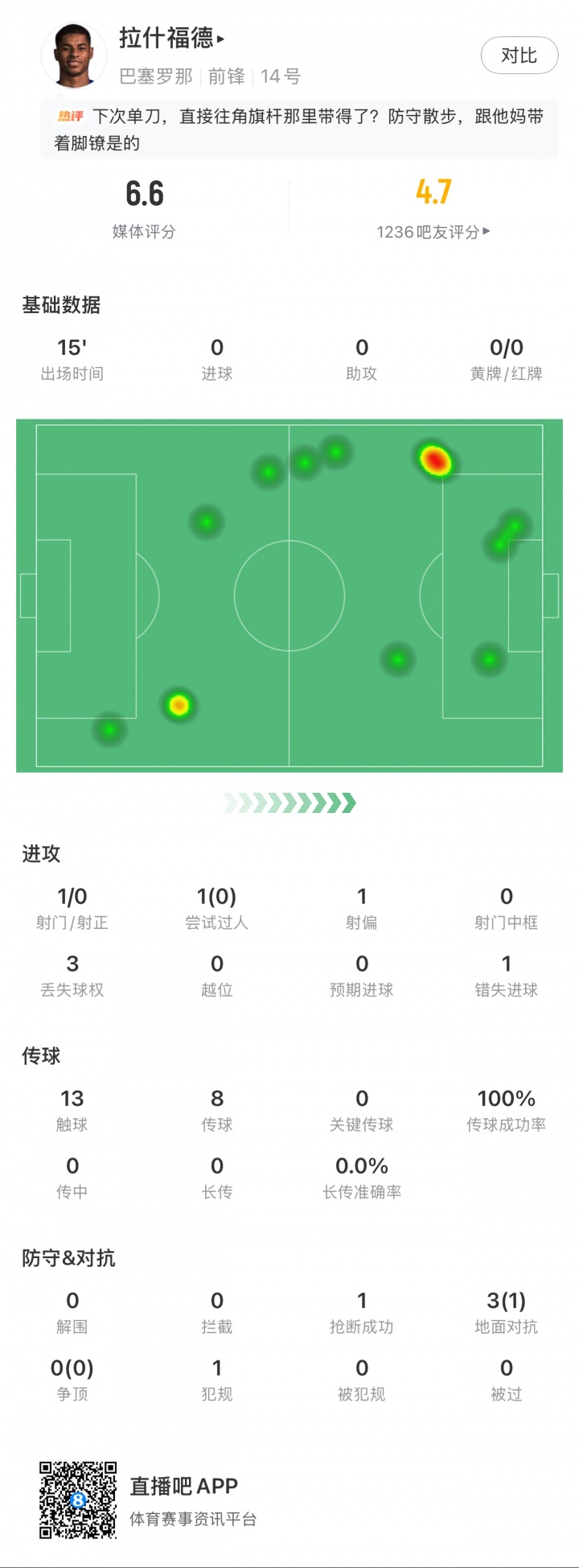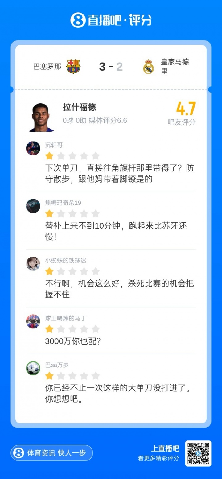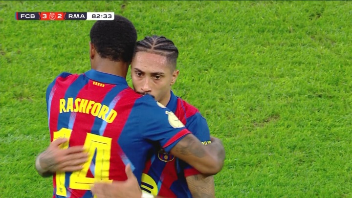 西班牙超级杯决赛,巴萨3-2击败皇马夺冠。拉什福德第83分钟换下拉菲尼亚,第95分钟时巴萨3-2领先皇马,拉什福德跑出半场大单刀,慢悠悠错失良机。转过头来皇马进攻,姆巴佩直塞禁区,居莱尔下底倒三角,卡雷拉斯点球点附近直面球门的推射被霍安没收,巴萨险些被绝平,拉什福德几乎全程眼神防守。