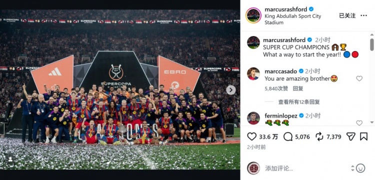 这是拉什福德加盟巴萨以来赢得的首个冠军,他在社交媒体上晒出全队与奖杯的合照,配文:“西超杯冠军!多么完美的新年开局!”