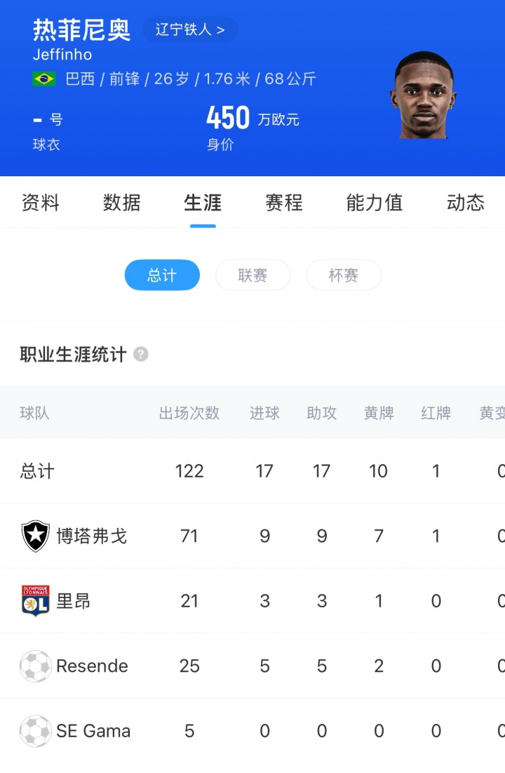 直播吧01月12日讯 官方消息,辽宁铁人租借签下巴西边锋热菲尼奥。球员身价450万欧,成目前中超第一身价。据德转显示,热菲尼奥的租借费为30万欧元。