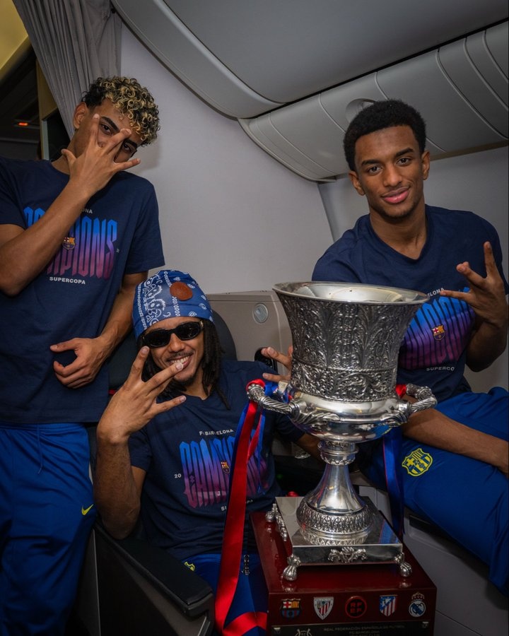 巴萨全队已经返回巴塞罗那,俱乐部官方社媒晒出球员们在飞机内与奖杯的合照,配文:“享受飞行旅途。”