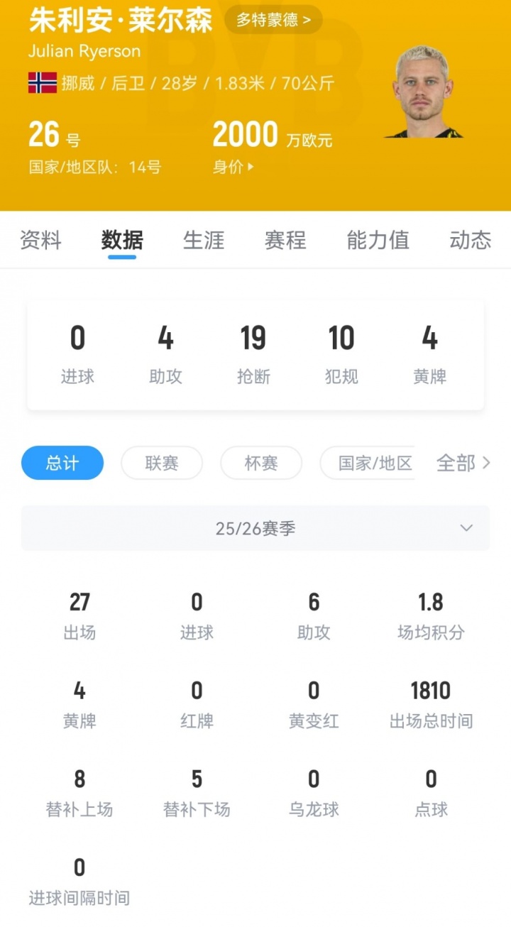 2023年多特花费500万欧从柏林联合引进莱尔森,如今他的德转身价已经达到了2000万欧,他与球队的合同2028年到期,来自利物浦的兴趣或许会让他重新考虑未来。