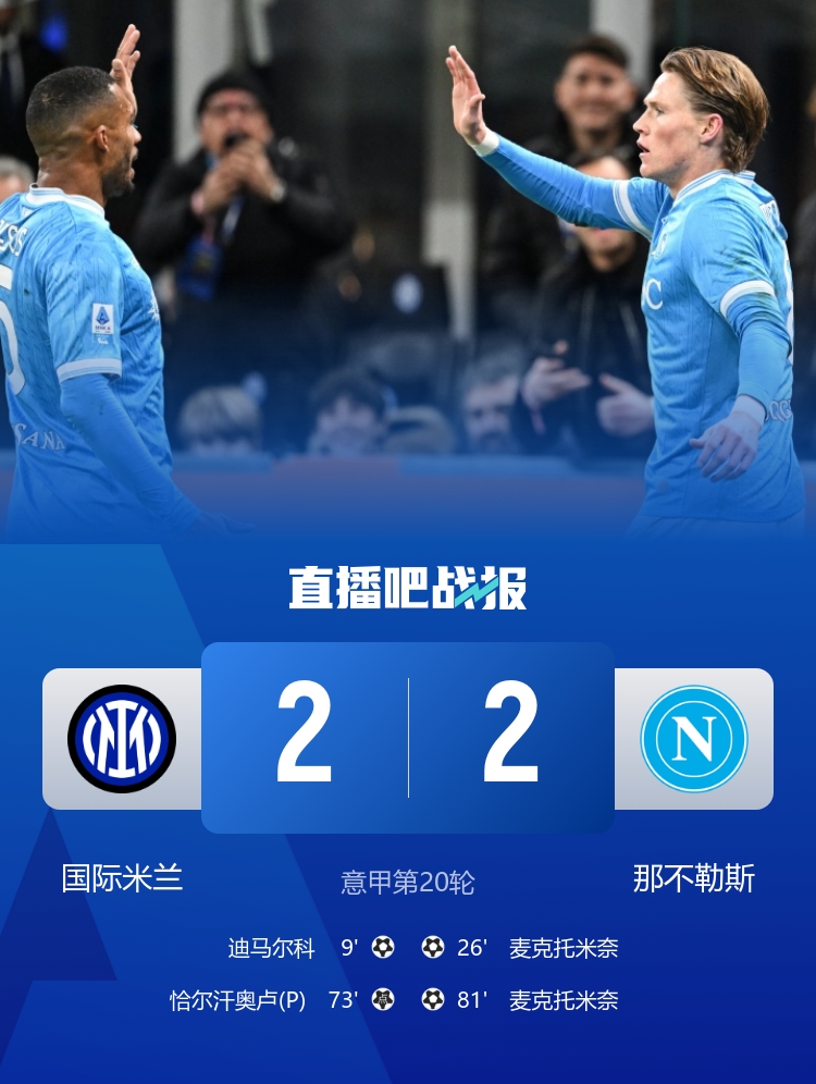 第81分钟,那不勒斯右路传中,底线位置诺阿·朗把球勾回,麦克托米奈抽射破门完成梅开二度!那不勒斯2-2再次扳平国米↓