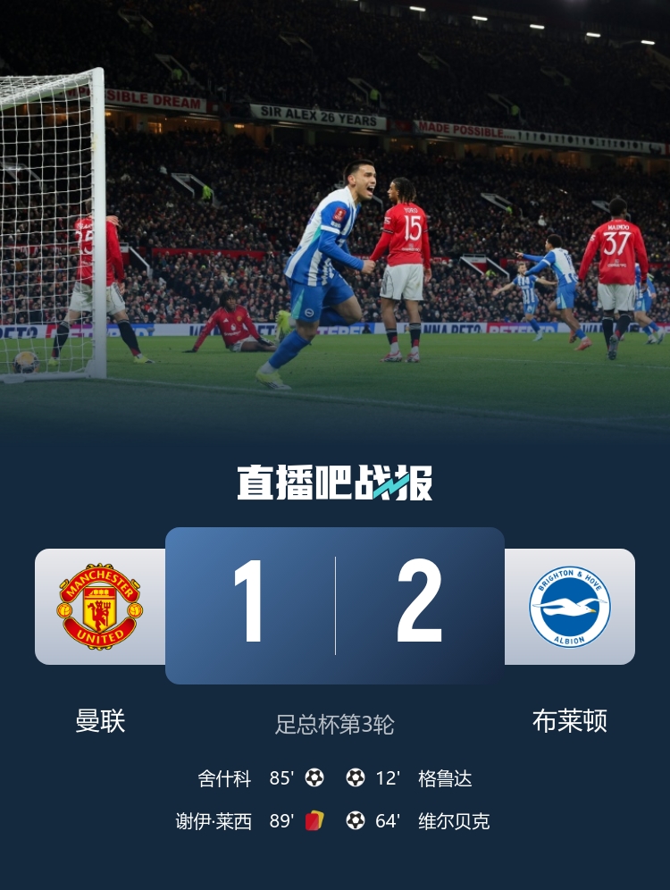 直播吧1月12日讯 北京时间00:30,足总杯第3轮曼联vs布莱顿,比赛在老特拉福德球场打响!上半场,达洛特错失单刀机会;格鲁达帮助布莱顿取得领先;拉门斯后场送礼险些丢球!下半场,维尔贝克爆射破门弑旧主;舍什科头球帮助曼联扳回一城;小将莱西90分钟砸球发泄,两黄变一红被罚下!最终,曼联1-2不敌布莱顿,足总杯一轮游出局。