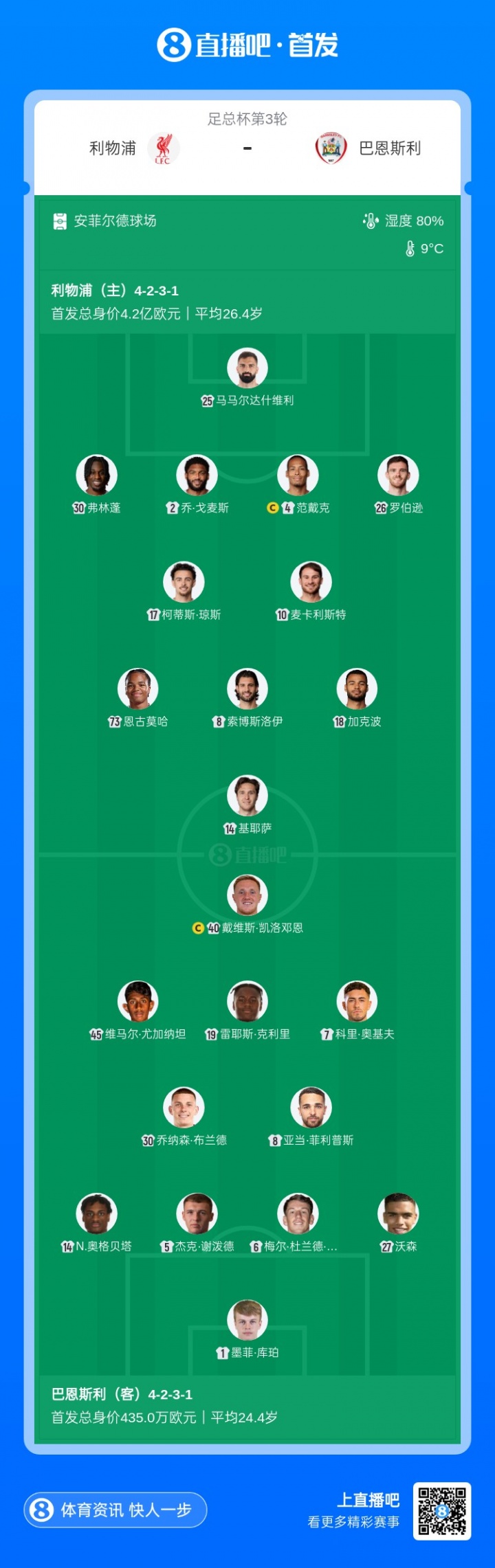 直播吧1月13日讯 北京时间1月13日3:45,足总杯第3轮,利物浦vs巴恩斯利。赛前利物浦公布了本场比赛的首发阵容。【本场比赛,利物浦方面基耶萨和恩古莫哈都迎来先发,维尔茨、埃基蒂克替补。】