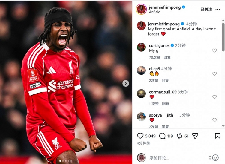 >弗林蓬社媒:我在安菲尔德的首粒进球,不会忘记这一天