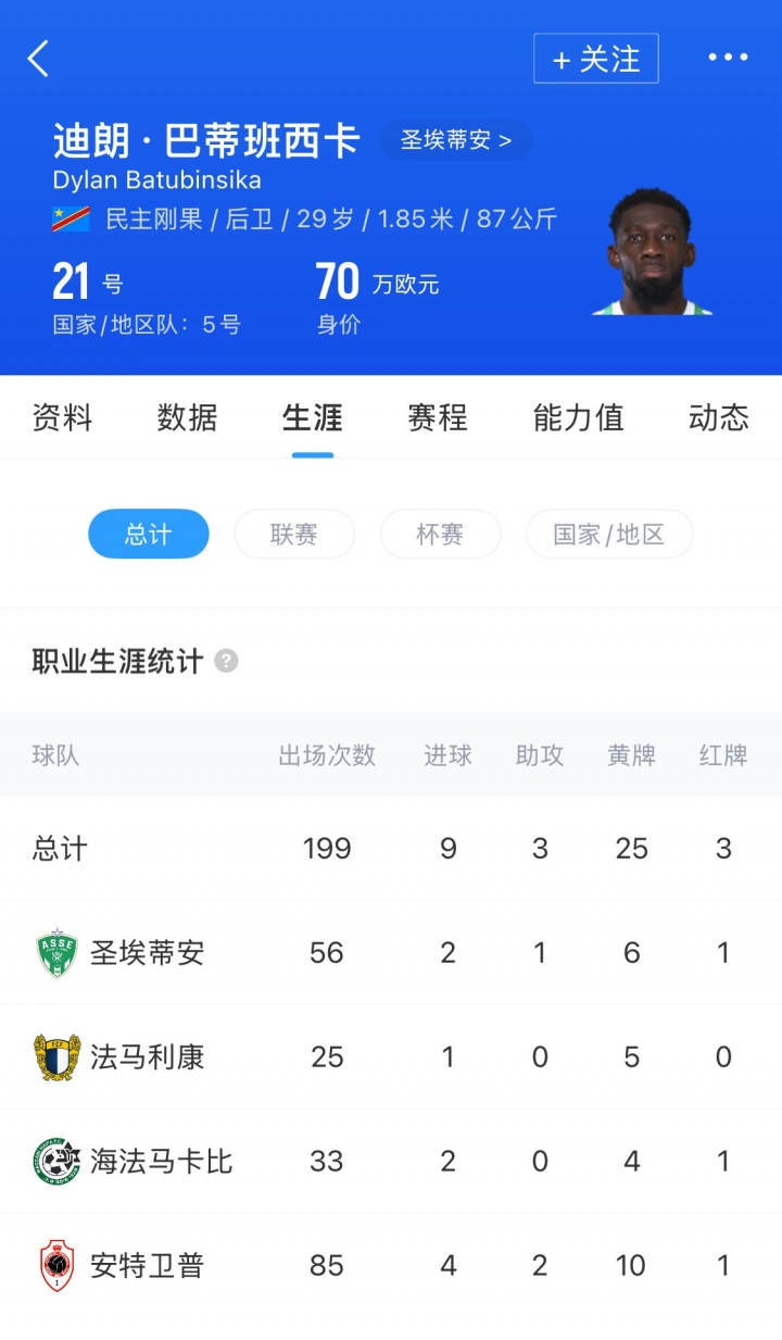 直播吧获悉,深圳新鹏城在放弃续约外援中卫杜加利奇后,已经找到了合适的替代人选。即将年满30岁、拥有法国/刚果民主共和国双重国籍的中卫迪朗·巴蒂班西卡已确定由法乙圣埃蒂安加盟新鹏城。
