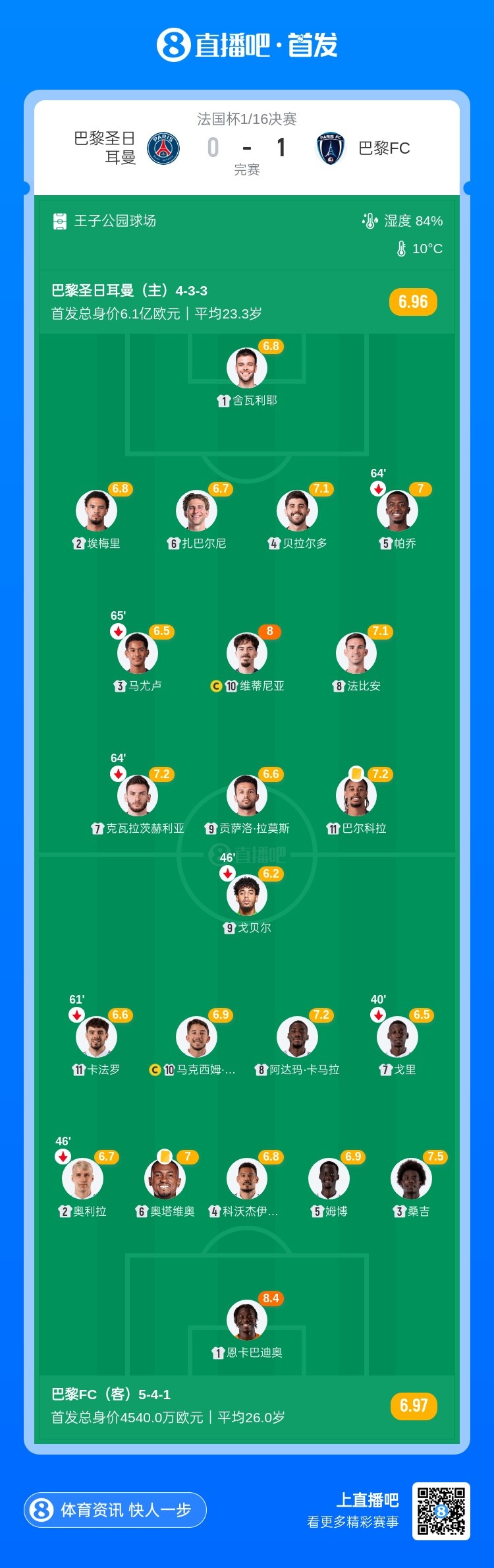 直播吧1月13日讯 北京时间4:10,法国杯1/16决赛巴黎圣日耳曼vs巴黎FC,比赛在王子公园球场打响!上半场,双方均无建树;下半场,登贝莱错失单刀机会,伊科内破门弑旧主!埃梅里击中门框!最终,巴黎圣日耳曼爆冷0-1不敌巴黎FC,止步法国杯32强!