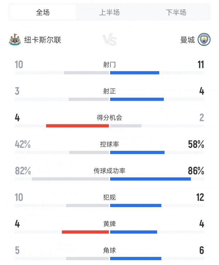 纽卡vs曼城全场数据: