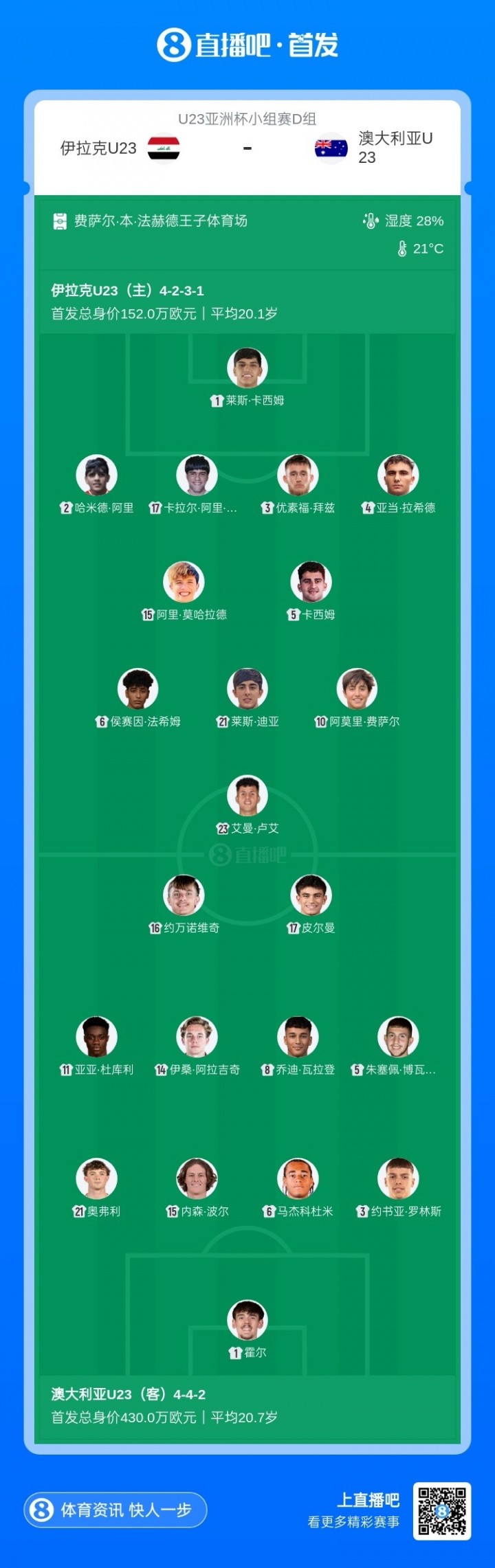 伊拉克U23首发:1-莱斯·卡西姆、17-卡拉尔·阿里·哈桑、2-哈米德·阿里、3-优素福·拜兹、4-亚当·拉希德、15-阿里·莫哈拉德、5-卡西姆、6-侯赛因·卡希姆、21-莱斯·迪亚、10-阿莫里·费萨尔、23-艾曼·卢艾
