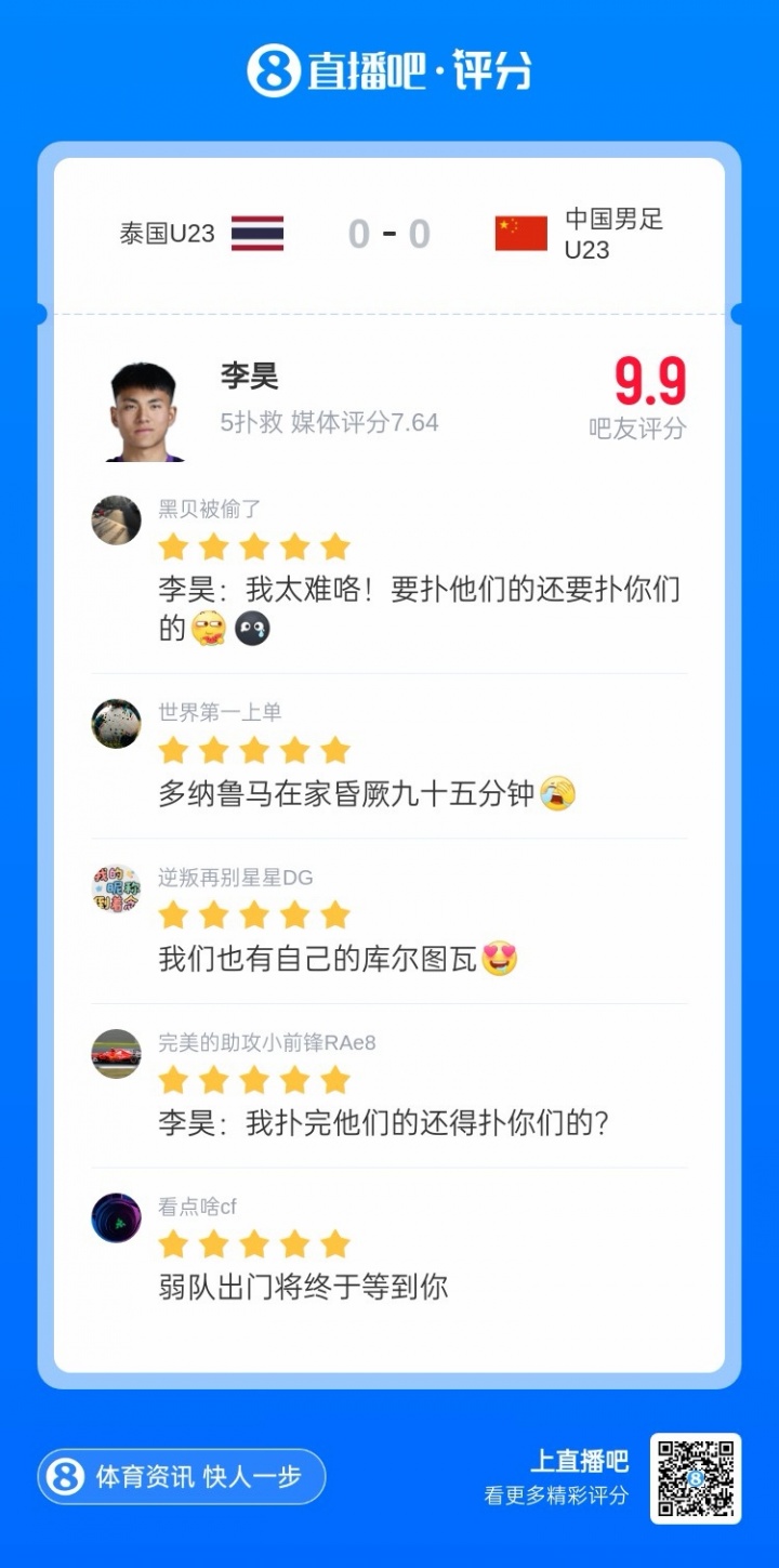 >吧友给李昊打9.9分:扑完对手还要扑队友!我们也有库尔图瓦!