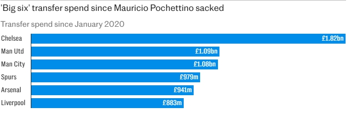 热刺以3500万镑签下加拉格尔,自2019年11月波切蒂诺下课以来,他们的转会总支出达到了9.79亿镑。与BIG6其它球队相比,热刺的转会支持已超越阿森纳和利物浦,仅次于切尔西和曼市双雄。