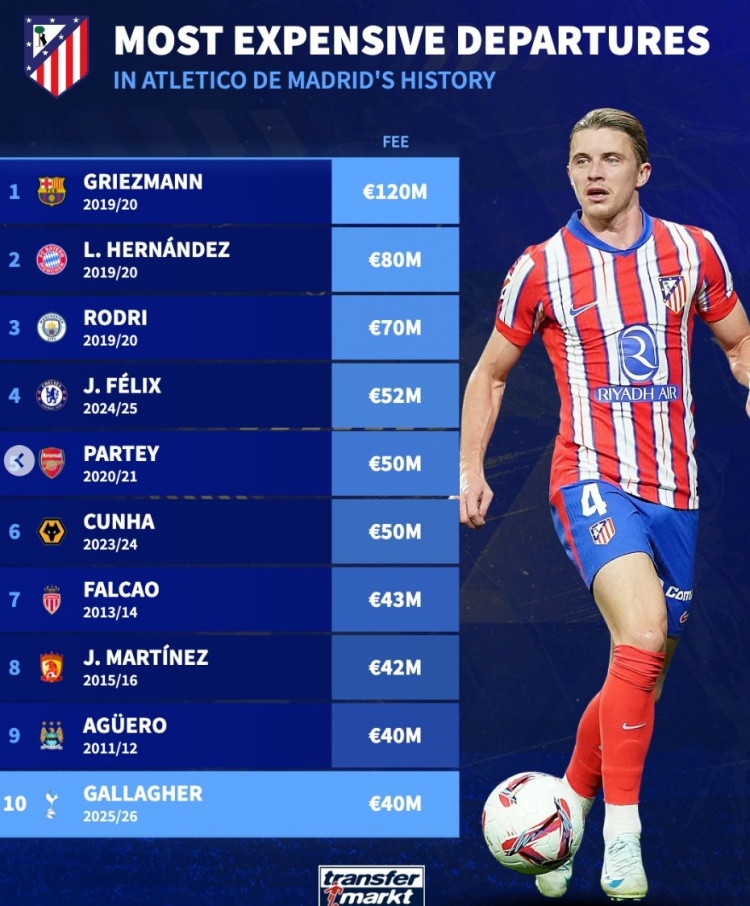直播吧1月15日讯 马竞已经官宣中场加拉格尔转会热刺,《转会市场》也统计了马竞队史最贵卖人情况,格列兹曼仍居首。