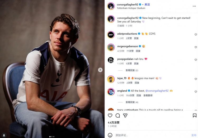 加拉格尔晒出自己的热刺定妆照,并表示:“新的开始。我已经等不及了,我们周六见!”