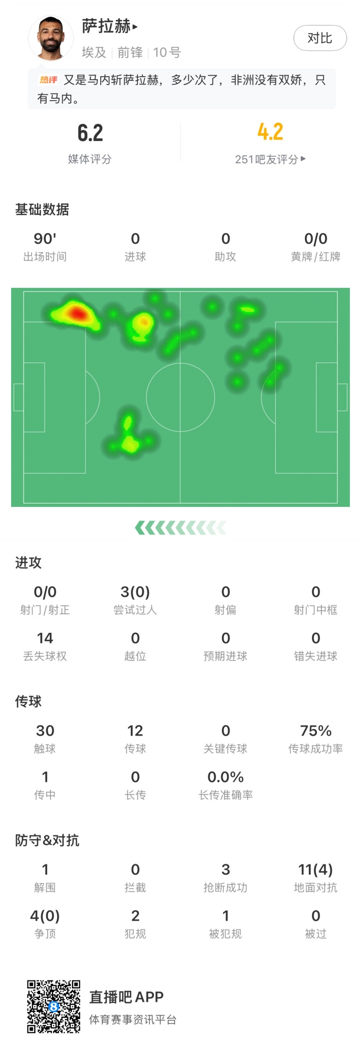 萨拉赫全场0球、0助、0射正、0射门、过人成功0、关键传球0,获媒体评分6.2分。