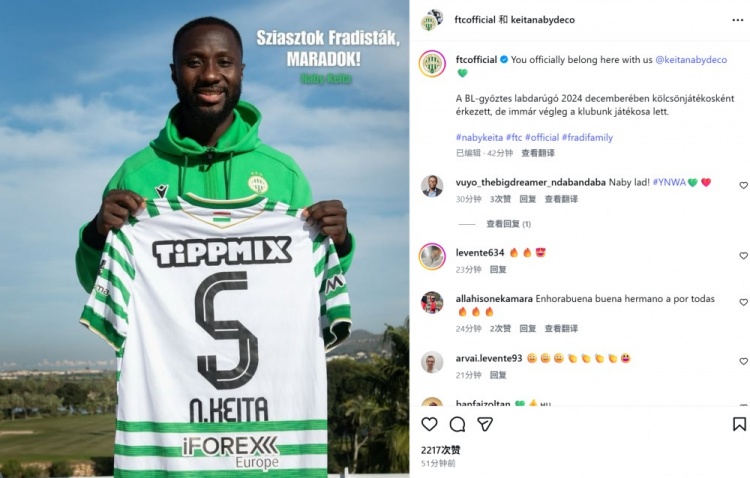 凯塔在去年冬窗被不莱梅外租费伦茨瓦罗斯,租借合同为期一年,现在正式永久转会,转会费为0。费伦茨瓦罗斯并未透露合同年限。当前德转身价仅剩150万欧元。