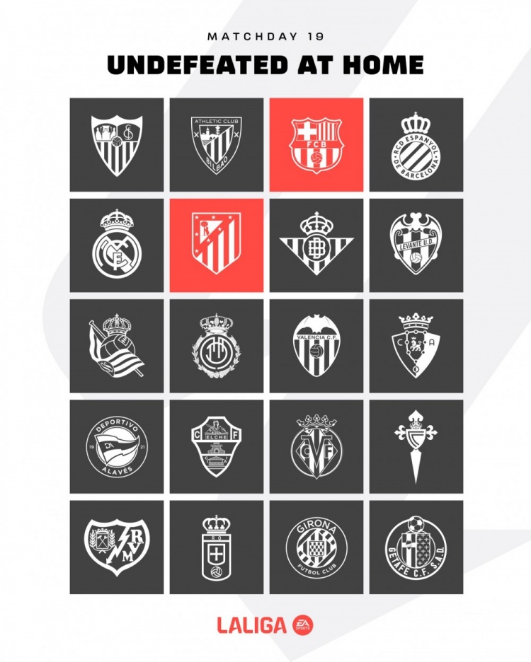 直播吧1月15日讯 据西甲官方统计,巴萨和马竞是本赛季仅有的两支西甲主场不败球队。