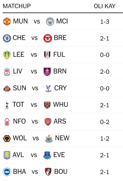 直播吧1月16日讯 The Athleti记者Oliver Kay预测本轮英超,该记者预测曼城将3-1击败曼联,切尔西、阿森纳、利物浦赢球。