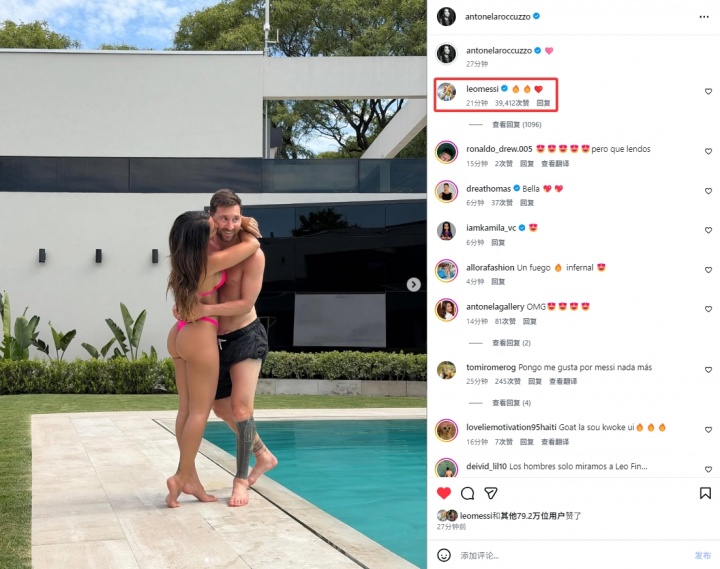 安东内拉发布5分钟后,梅西也现身评论区,用一串表情评论:“
