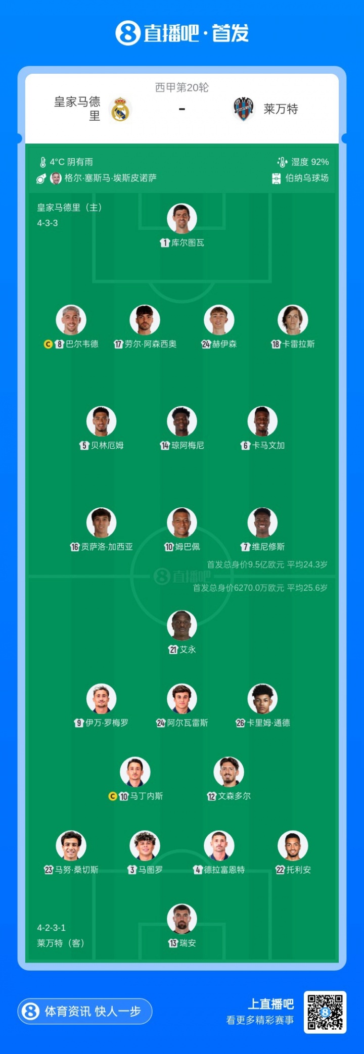 皇马首发:1-库尔图瓦、17-劳尔·阿森西奥、18-卡雷拉斯、24-赫伊森、8-巴尔韦德、5-贝林厄姆、6-卡马文加、14-琼阿梅尼、7-维尼修斯、10-姆巴佩、16-贡萨洛·加西亚