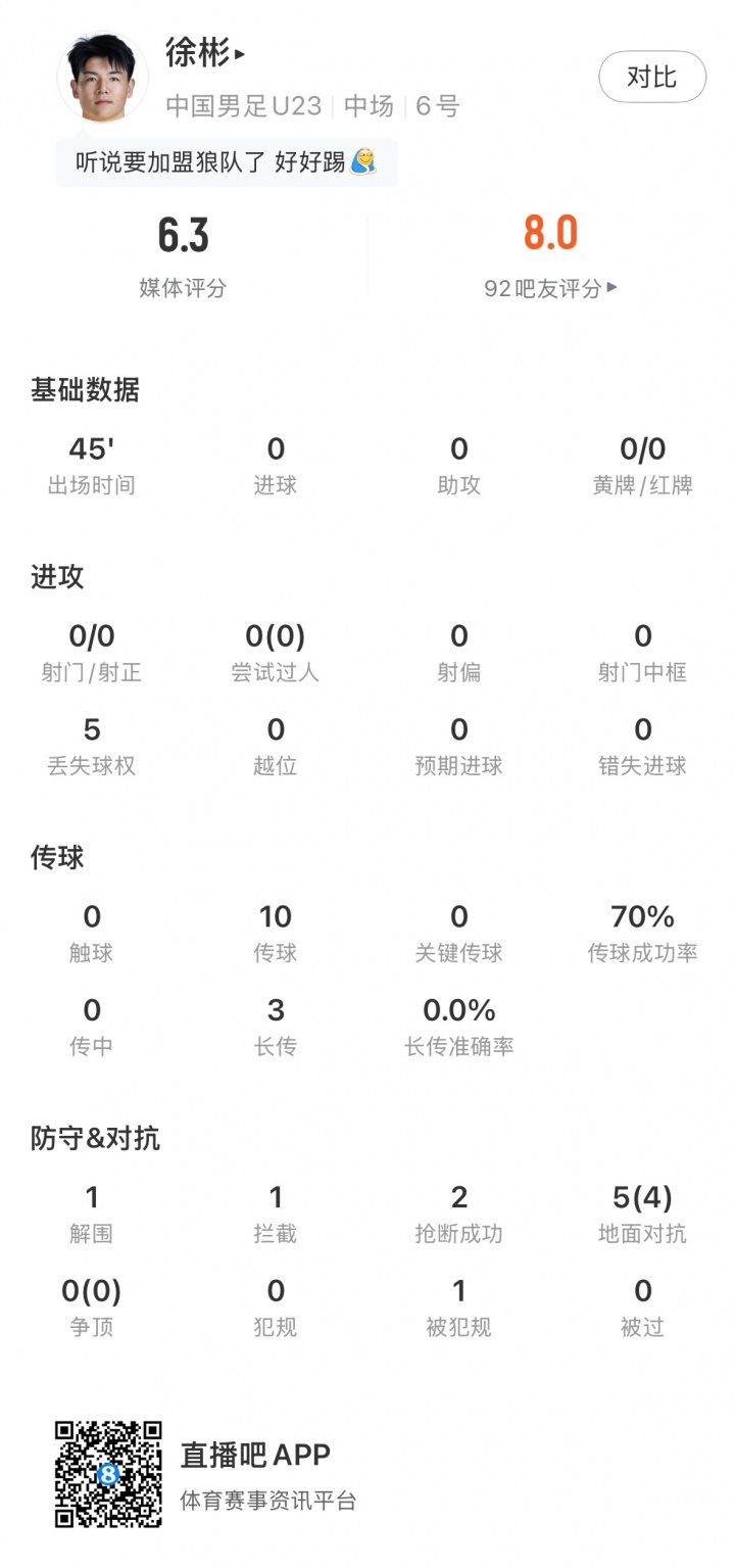 上半场U23国足队长徐彬疲于防守,10次传球,70%传球成功率。1次解围1次拦截2次抢断,5次地面对抗4次成功。