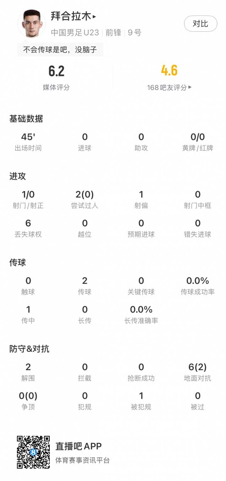 上半场拜合拉木仅有2次传球均失败,2次成功解围,6次地面对抗2次成功。造了对方一张黄牌。