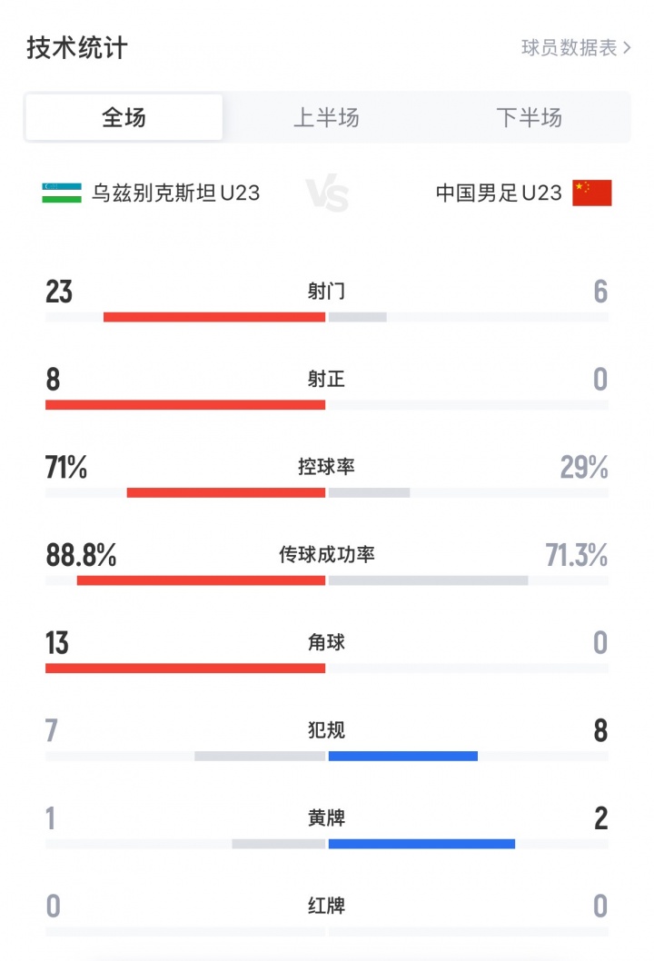 >顽强!U23国足本场数据全面落后 仅3成控球被射23脚 最后进4强!