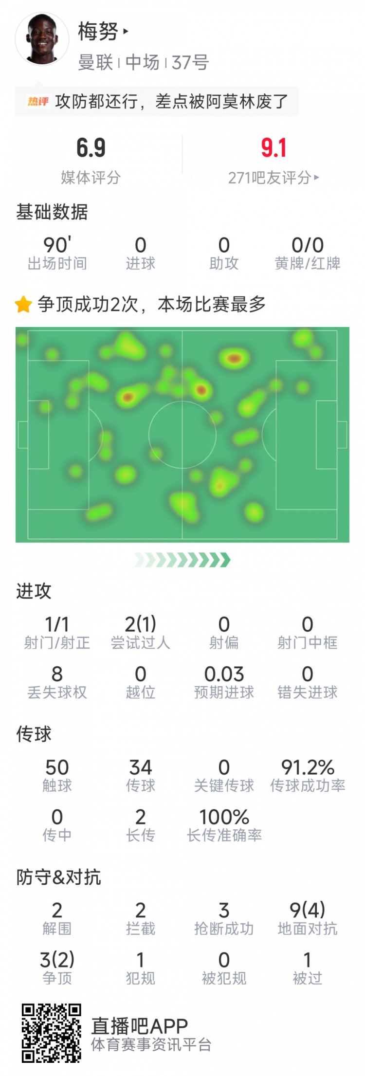 直播吧1月17日讯 在本轮英超曼市德比,曼联2-0击败曼城,梅努迎来本赛季首次英超首发,以下为他在本场数据: