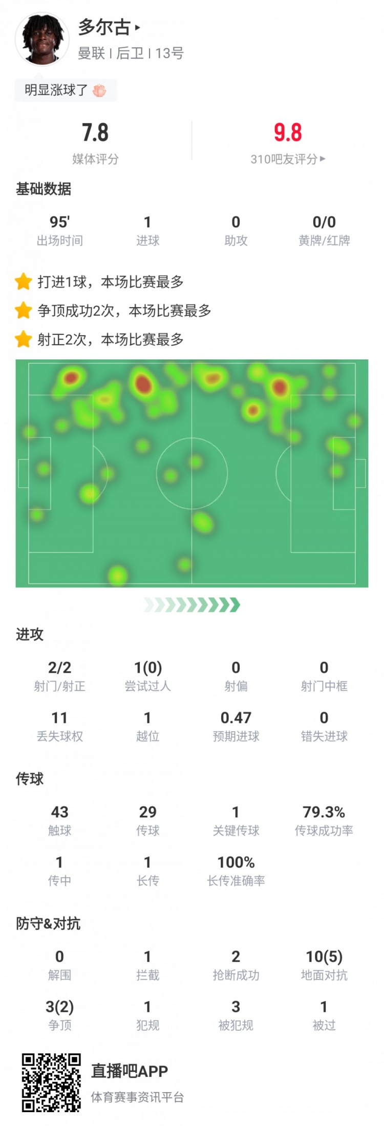 直播吧1月17日讯 曼联在本轮英超2-0击败曼城,多尔古代表曼联首发踢满全场,并打进1球,以下是他的数据。