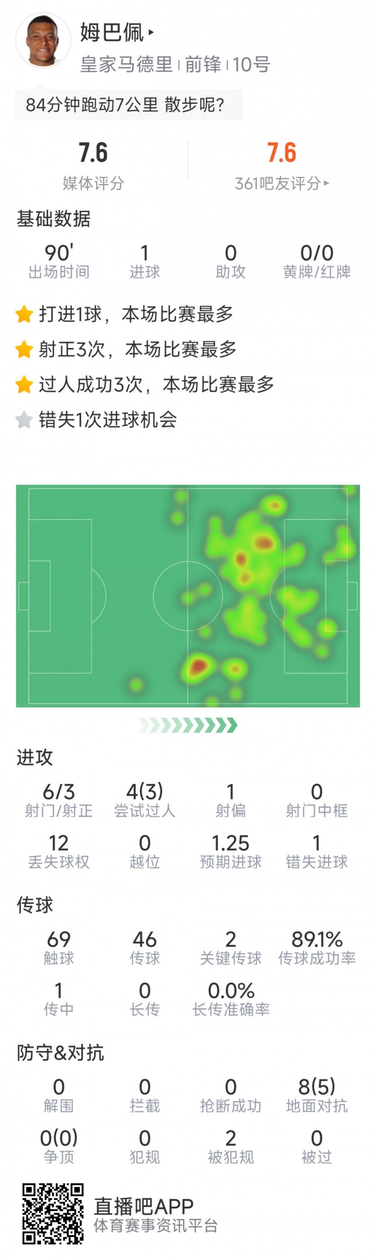 直播吧1月17日讯 在本轮西甲,皇马2-0击败莱万特,以下为姆巴佩本场数据: