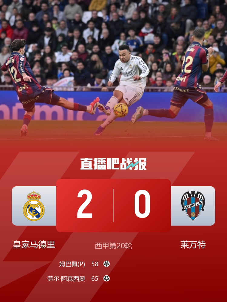 直播吧1月17日讯 北京时间1月17日21:00,西甲第20轮皇马迎战莱万特的比赛在伯纳乌球场进行,上半场姆巴佩凌空抽射造险,皇马半场仅1射正,半场结束,皇马0-0莱万特。下半场姆巴佩造点+点射打破僵局,居莱尔助攻阿森西奥头球破门扩大比分,马斯坦托诺兜射中楣,最终皇马2-0莱万特先赛距榜首1分,阿韦罗亚收获执教皇马首胜。