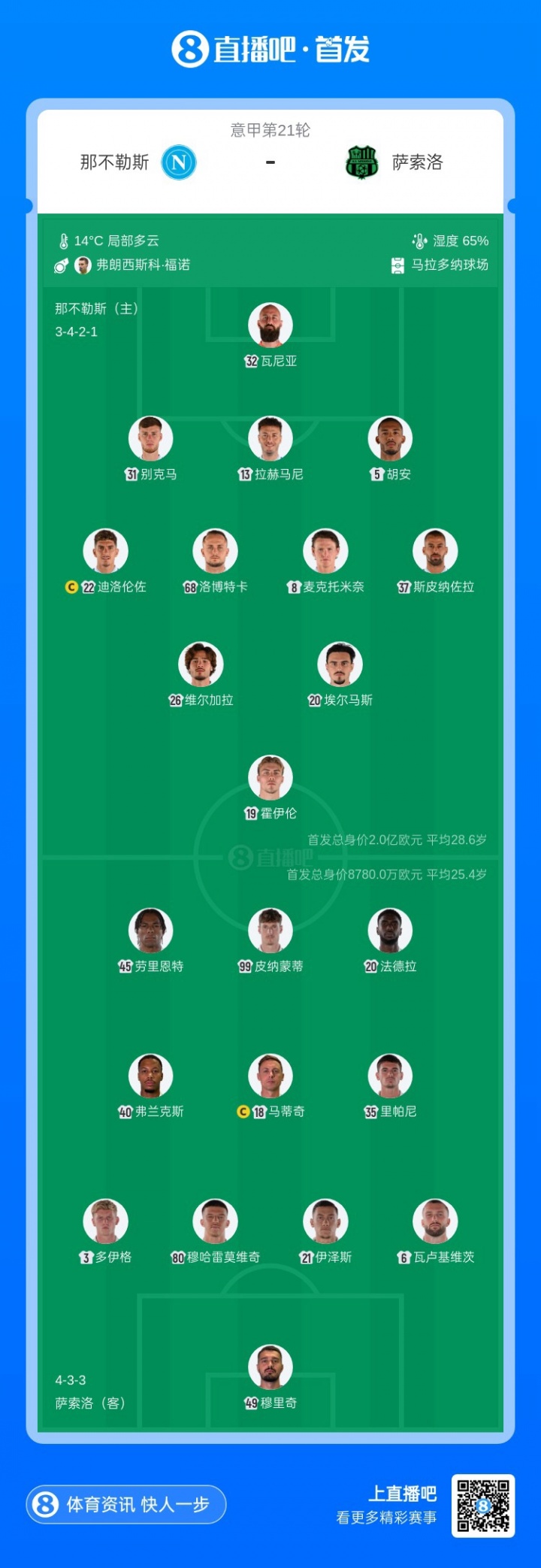 直播吧1月18日讯 意甲第21轮,那不勒斯主场迎战萨索洛,赛前双方首发公布。