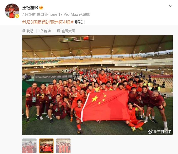 直播吧01月18日讯 U23亚洲杯1/4决赛,U23国足点球大战战胜乌兹别克斯坦。王钰栋更新社媒庆祝再次创造历史,附文:继续!