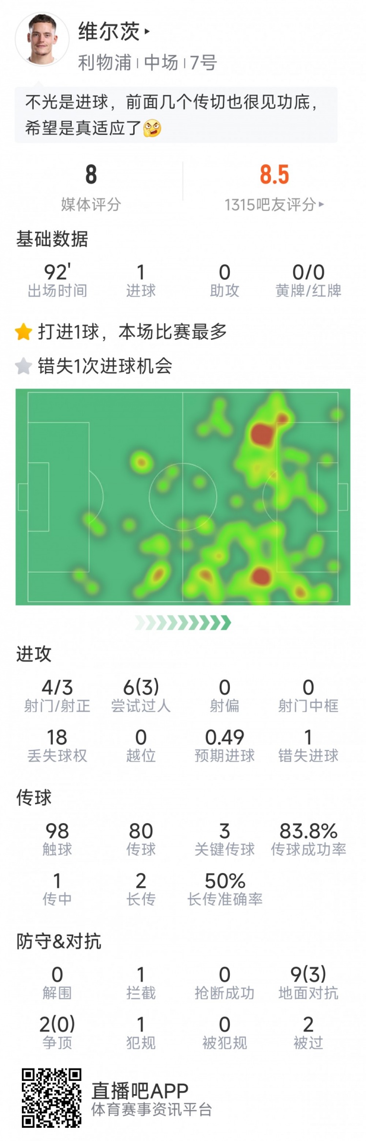 直播吧1月18日讯 在本轮英超,利物浦1-1战平伯恩利。以下为维尔茨本场数据: