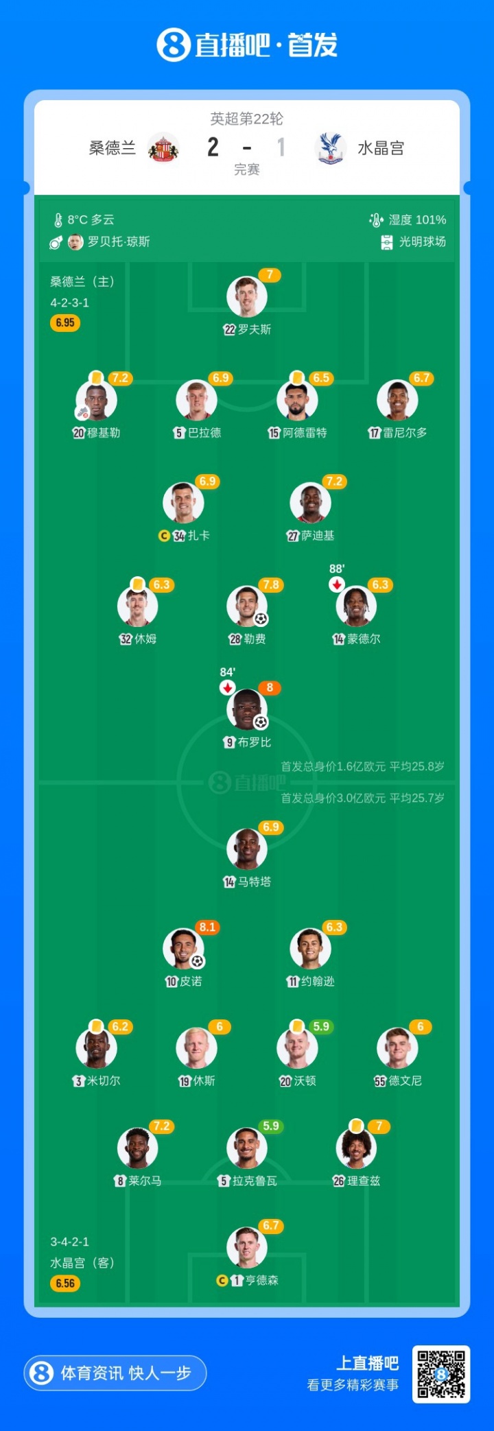 >水晶宫不敌桑德兰遭遇10场不胜,格拉斯纳全场0换人、格伊缺战