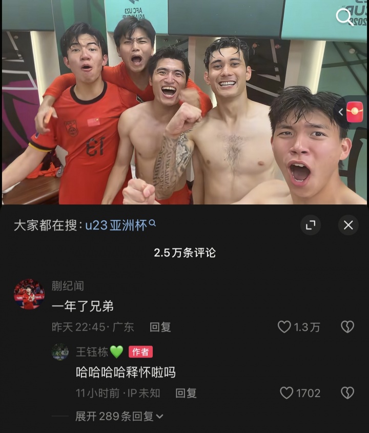 直播吧01月18日讯 U23国足闯入U23亚洲杯半决赛,王钰栋社媒晒出更衣室庆祝视频,蒯纪闻评论“一年了兄弟”,王钰栋回复“哈哈哈哈释怀啦吗”。