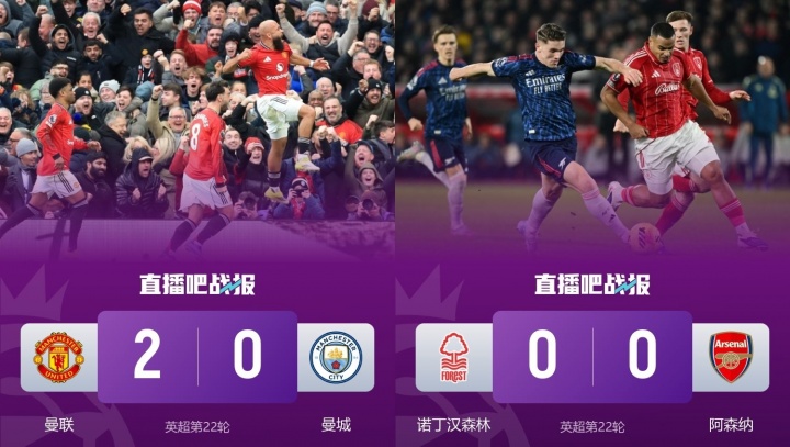 直播吧01月18日讯 英超第22轮战罢多场,阿森纳0-0森林丢了2分,曼城0-2曼联丢了3分。