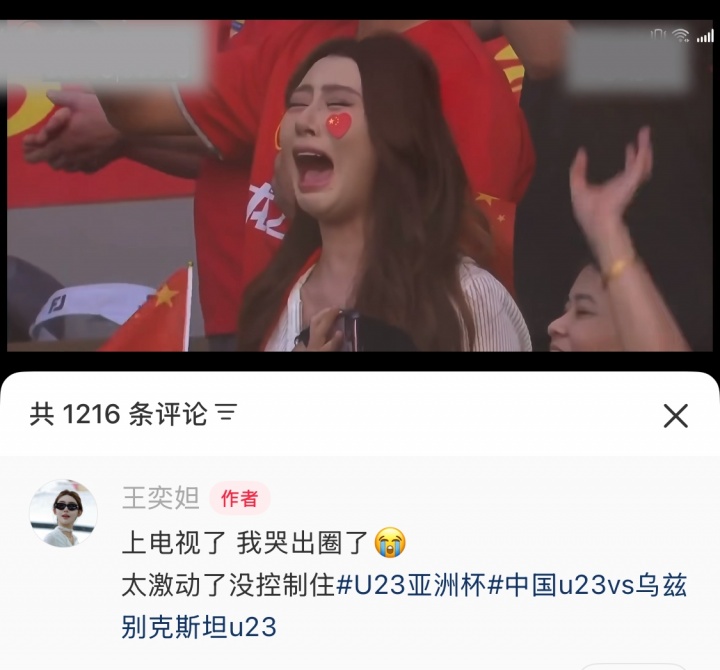 >为U23国足喜极而泣的女球迷:我哭出圈了,太激动了没控制住