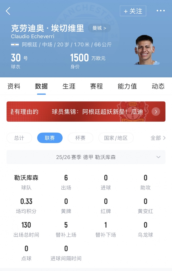 埃切维里现年20岁,2024年底从河床加盟曼城,转会费1850万欧。去年夏窗被租借至勒沃库森,代表勒沃库森出场11次送出1次助攻。目前埃切维里的德转身价为1500万欧元。