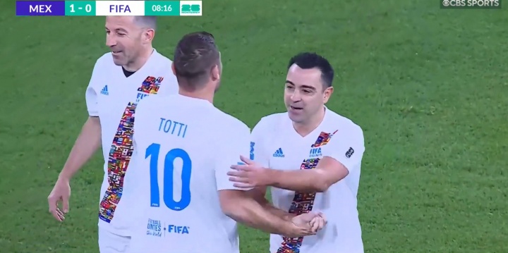 比赛中,托蒂与哈维两人连线,最终哈维轻巧挑射破门。