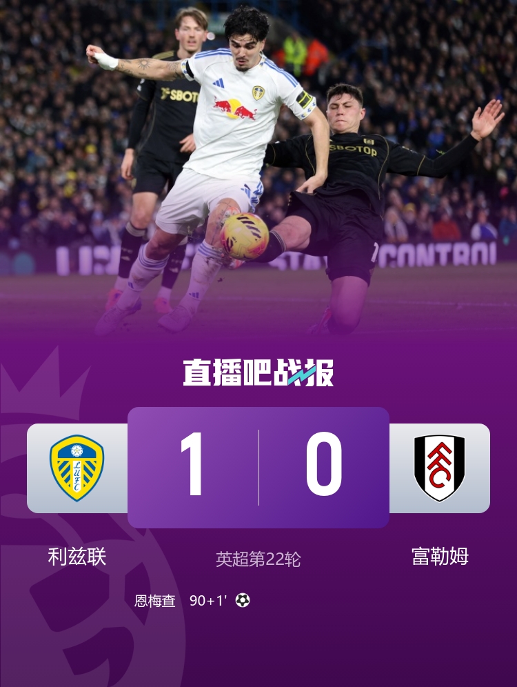 直播吧1月18日讯 北京时间1月17日晚上23:00,英超第22轮,利兹联坐镇埃兰路球场迎战富勒姆。上半场,莱诺低级失误险送礼,阿隆森失单刀。下半场,恩梅查91分钟绝杀。全场结束,利兹联1-0富勒姆。本场过后,利兹联积25分排名第十六,富勒姆积31分暂列第十。