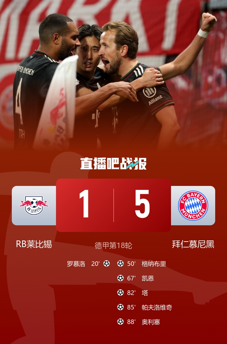 直播吧1月18日讯 德甲第18轮,RB莱比锡坐镇主场莱比锡红牛竞技场迎战拜仁慕尼黑。上半场,罗慕洛先拔头筹,努萨错失良机。易边再战,格纳布里、凯恩破门,迪奥曼德失单刀,塔、帕夫洛维奇、奥利塞连进三球,穆西亚拉复出送助攻。最终拜仁5-1莱比锡。积分榜方面,拜仁50分以11分优势领跑,莱比锡32分第四。