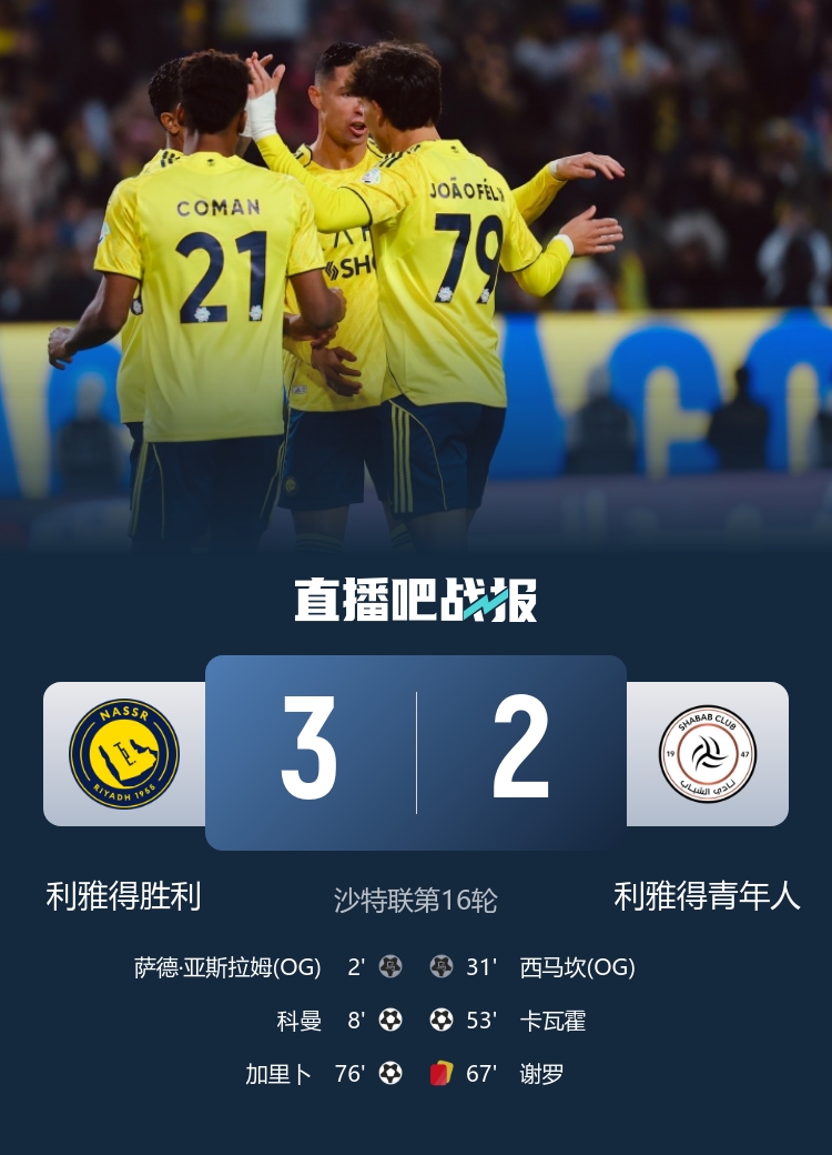直播吧1月18日讯 北京时间1月18日凌晨1时30分,2025-26赛季沙特联第16轮在沙特国王大学体育场展开角逐,利雅得胜利主场迎战利雅得青年人。上半场菲利克斯造乌龙,科曼倒钩破门,西马坎乌龙,下半场卡瓦霍单刀扳平,谢罗染红,加里卜替补建功。最终利雅得胜利主场3-2险胜十人利雅得青年人,胜利终结联赛4轮不胜,积34分位居第2名+先赛距榜首新月4分。