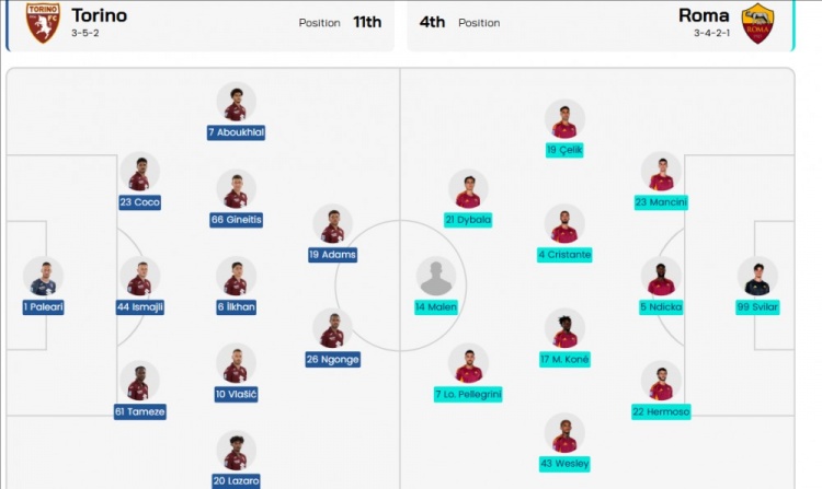 罗马首发:99-斯维拉尔;22-埃尔莫索、5-恩迪卡、23-詹卢卡·曼奇尼;43-韦斯利、17-科内、4-克里斯坦特、19-切利克;7-佩莱格里尼、14-马伦、21-迪巴拉。