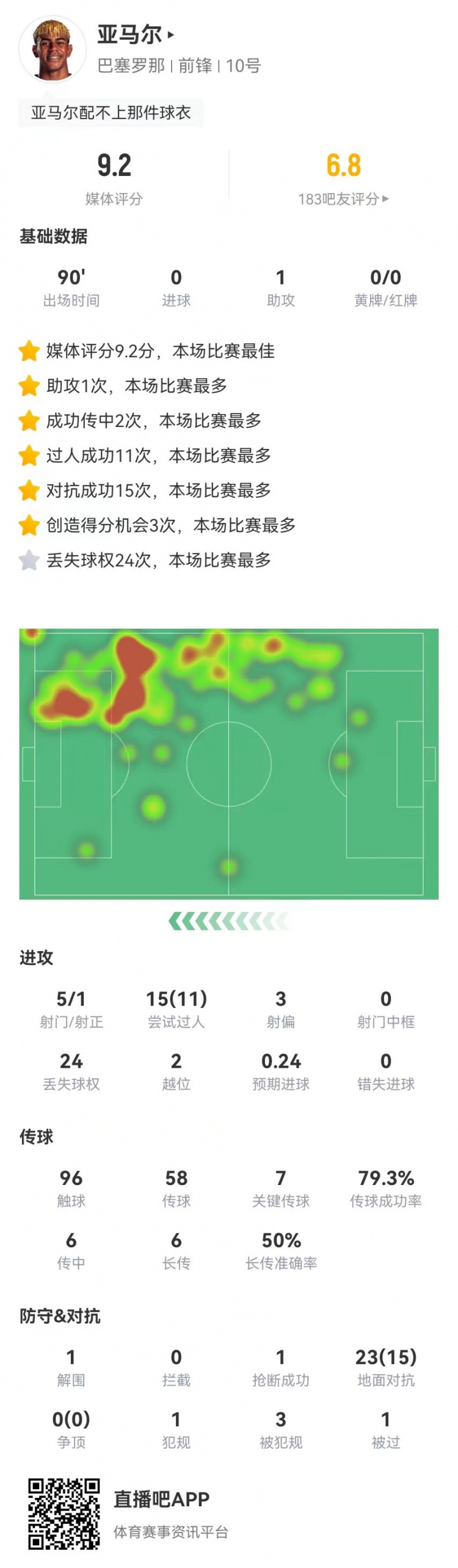 直播吧1月19日讯 巴萨在本轮西甲1-2不敌皇社,亚马尔本场数据如下: