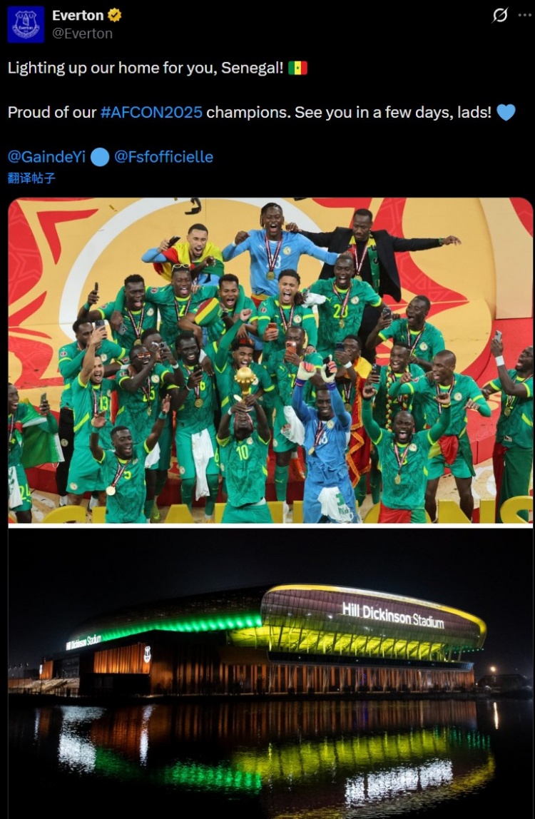 埃弗顿社媒也晒出主场呈现塞内加尔国旗配色的灯光秀,并送上祝贺:“塞内加尔,我们为你而点亮家园!为我们的非洲杯冠军们感到骄傲!几天后见,伙计们! 💙”