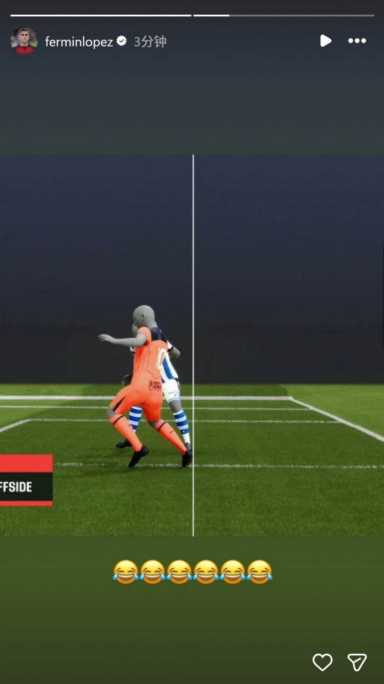 费尔明赛后在社交媒体上晒出亚马尔越位的VAR划线图,并配上笑哭的表情,对判罚表示质疑。