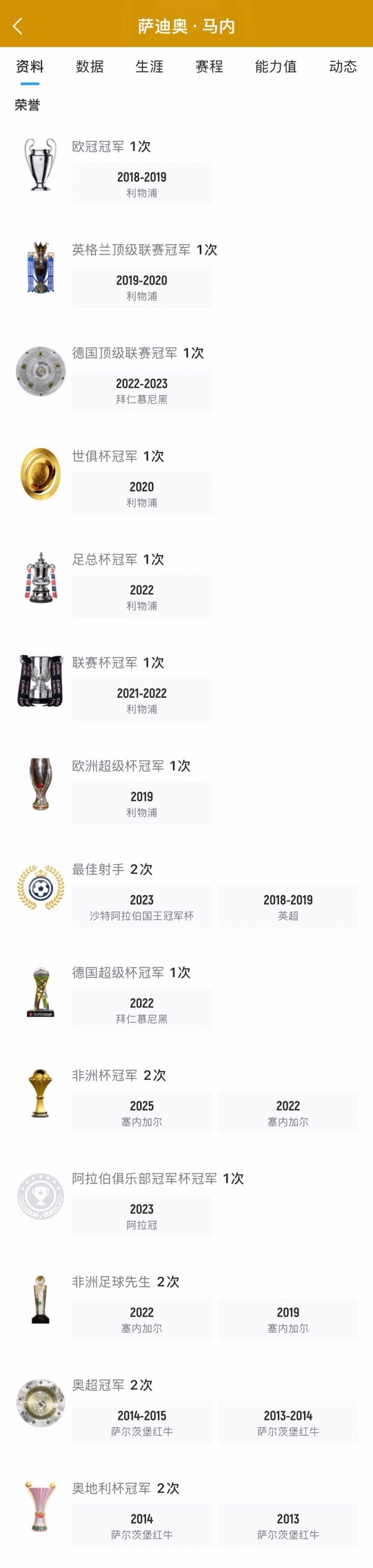 此外,马内的荣誉簿上还有联赛杯、欧超杯、德超杯等锦标。