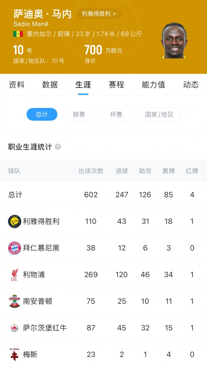 33岁的马内职业生涯至今已斩获多项冠军,其中最重要的当属两座非洲杯冠军、一座欧冠冠军、一座英超冠军、一座德甲冠军、一座世俱杯冠军以及一座足总杯冠军。